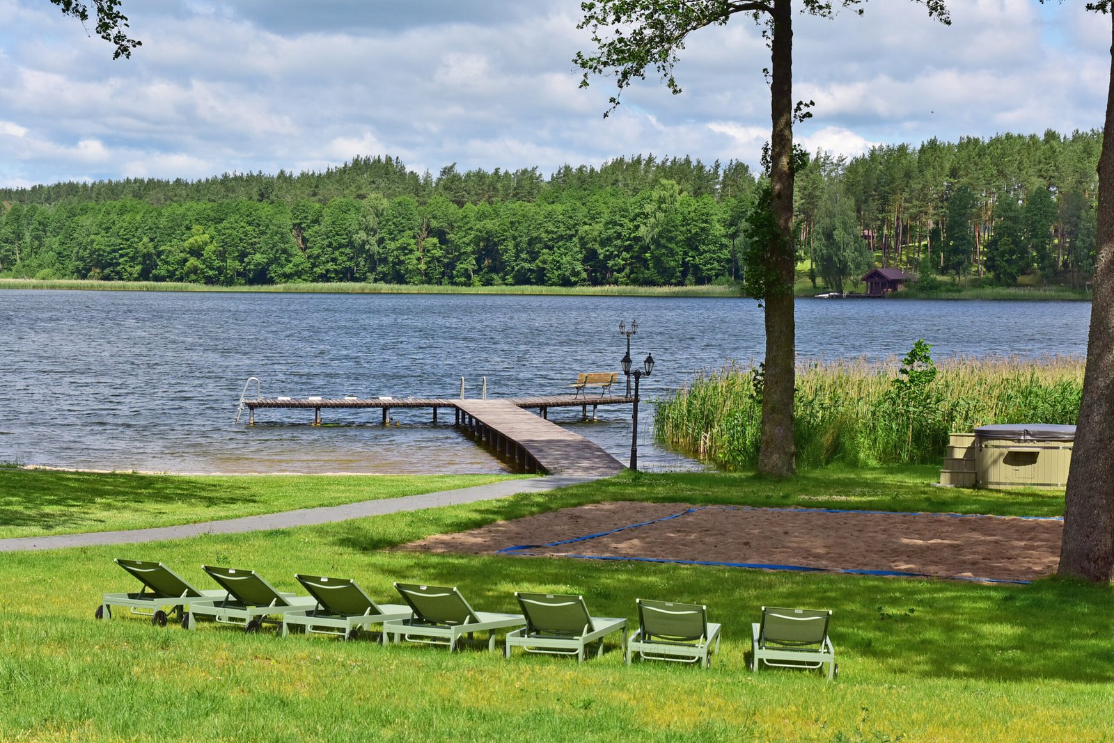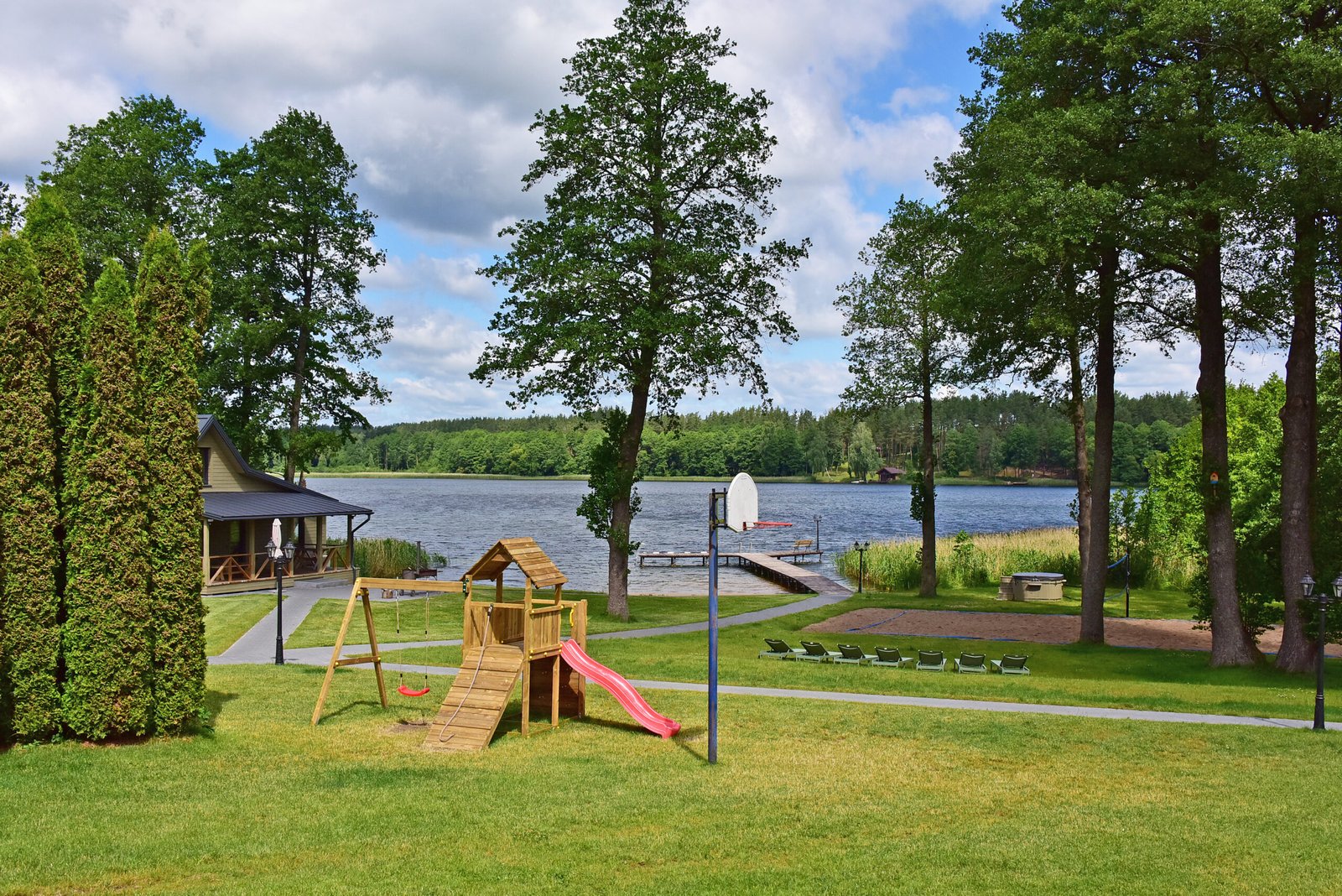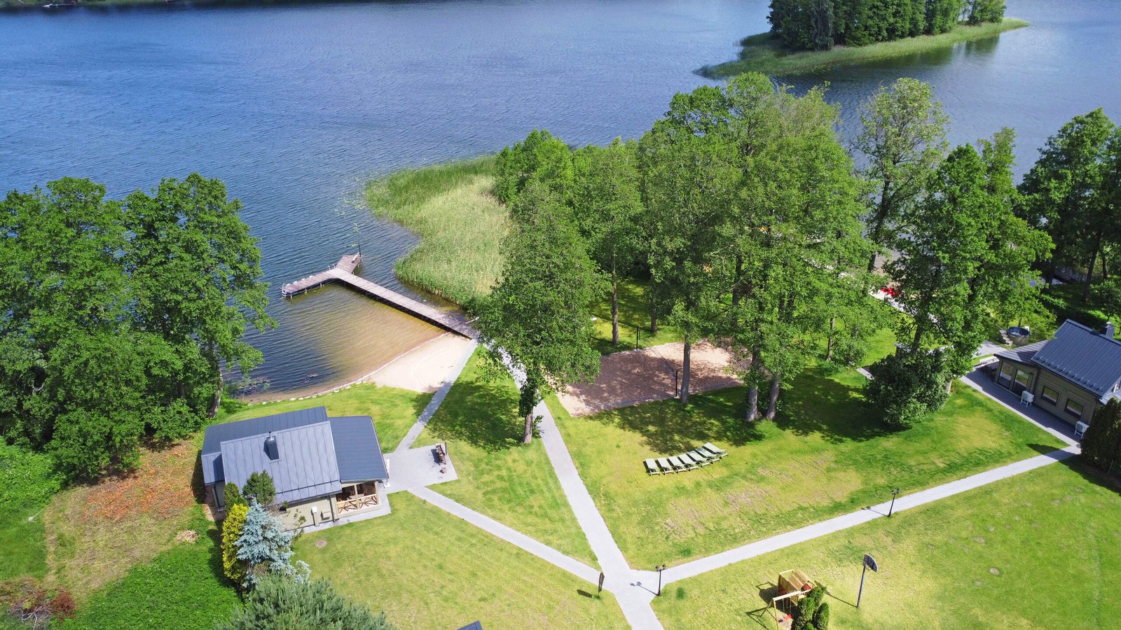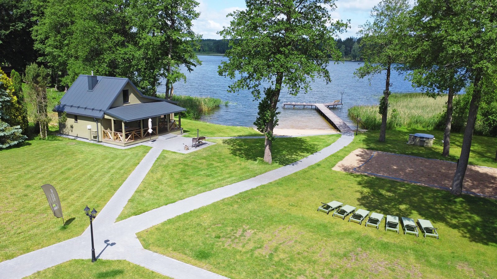 Vidutinio dydžio dviejų aukštų namas, kuriame komfortiškai galėsite pailsėti 10 žmonių kompanijoje. Namas su visais patogumais, virtuvė ir poilsio erdvė su vaizdu į ežerą. Name yra įrengta pirtis, talpina iki 12 žmonių. Šalia namo yra masažinis kubilas su vandens ir oro burbuliukais.