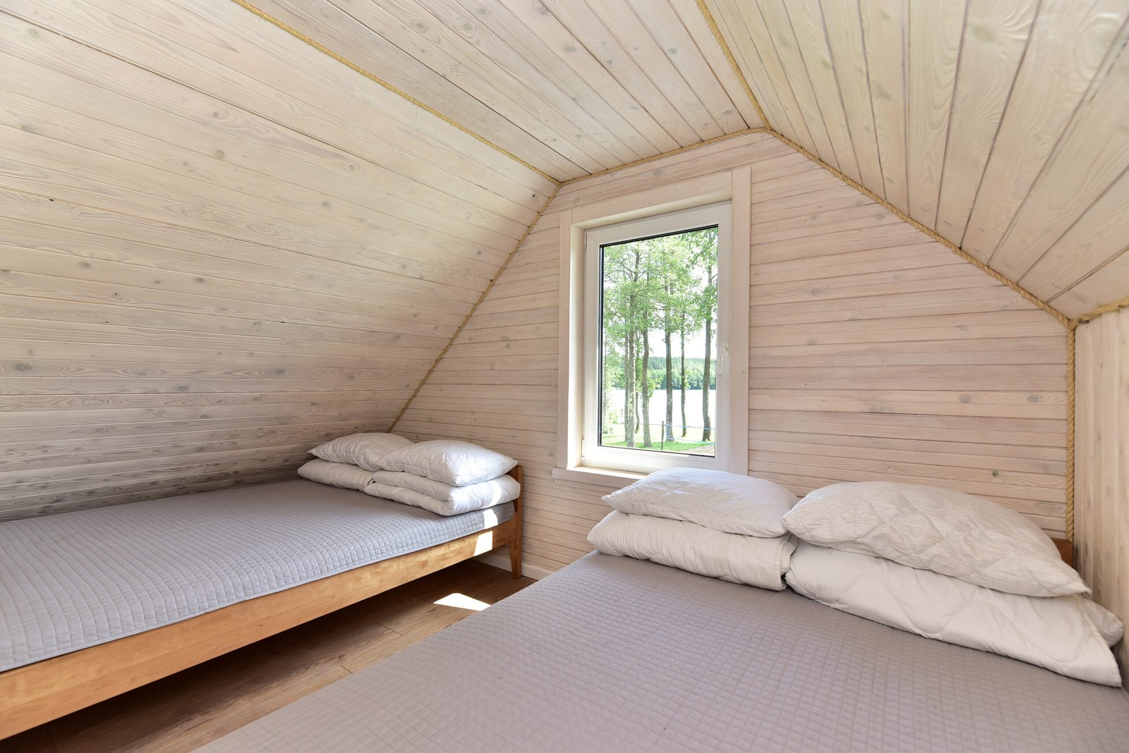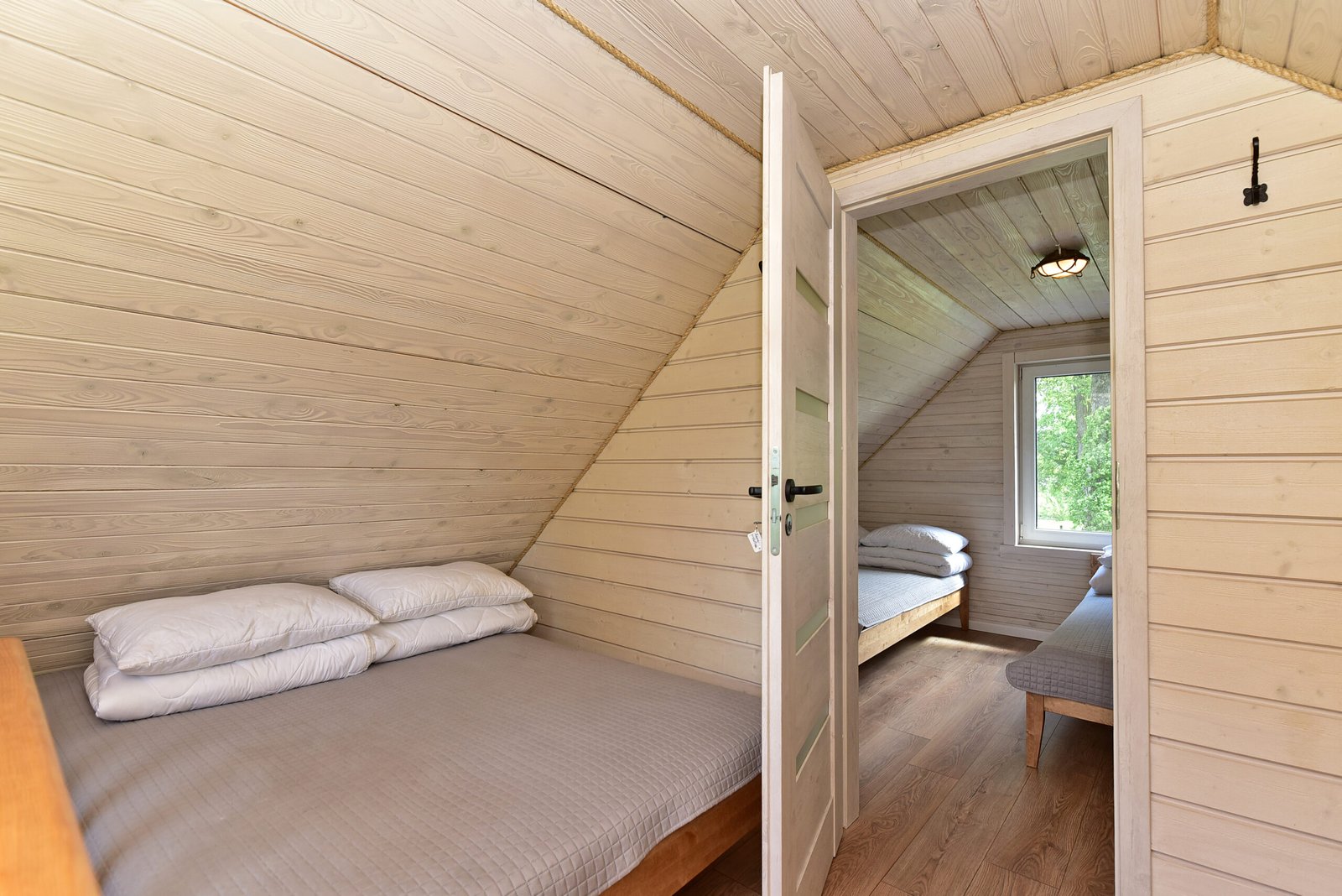 2 aukštas: 2 dvigulės lovos viename kambaryje ir 1 dvigulė lova pereinamajame kambaryje.